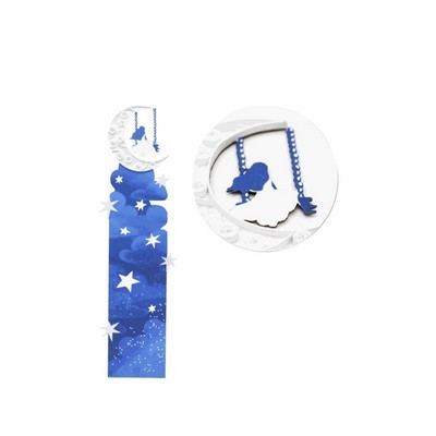 Αυτός ο ξεχωριστός χειροποίητος σελιδοδείκτης απεικονίζει ένα κορίτσι σε κούνια, καθισμένο στο μισοφέγγαρο.